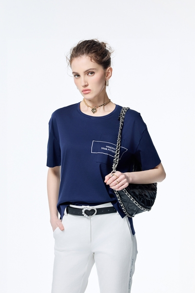 經典翻領加長版西裝外套,流行海軍藍色,柔軟彈性材質,蝴蝶結飾口袋,前中鈕釦扣合,後下擺開衩。
