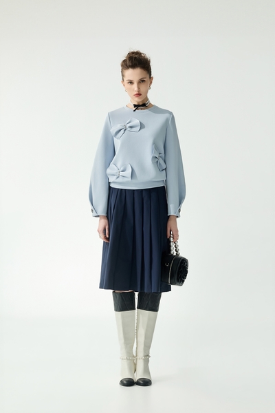 經典西裝翻領長袖外套,流行濃厚靛藍,整件做跳色刺繡線條造型,前有裝飾微笑口袋唇,前中鈕釦扣合,花朵別針。