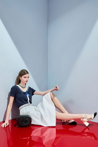 塔夫材質,腰部寬版,腰下抽皺,黑白色拼接,後中隱拉,有內裏,斜邊口袋。