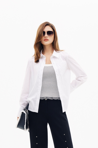 塔夫材質,腰部寬版,腰下抽皺,黑白色拼接,後中隱拉,有內裏,斜邊口袋。