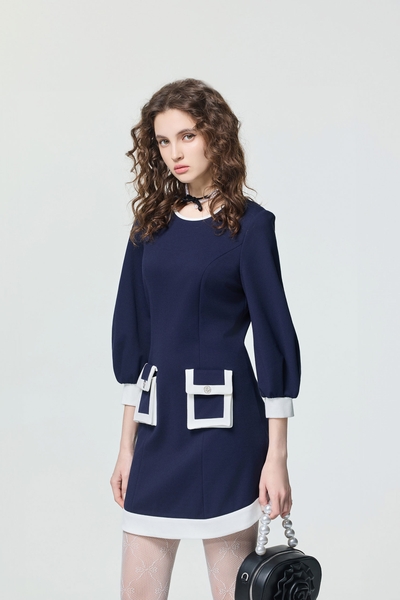 中腰、有腰頭大寬褲。流行復古藍,前有摺飾,後腰鬆緊設計,四口袋配置,拉鍊褲襠,頂部鈕釦扣合。