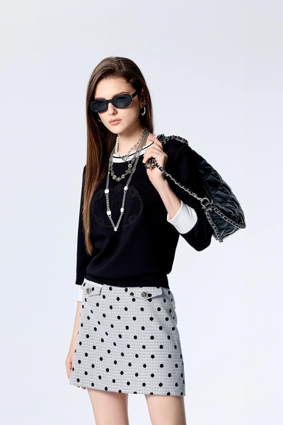 絲棉材質,領片領巾式設計,全長袖,袖口布兩顆釦扣合。前開襟,門襟七顆貓眼金屬釦扣合,領巾領耳下方一顆珍珠縫飾。附細肩帶內搭。