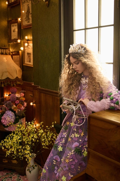 中低腰有腰頭牛仔寬褲,做流行柔紫色水洗造型,綴花卉裝飾,五口袋,拉鍊褲襠,頂部鈕釦扣合。
