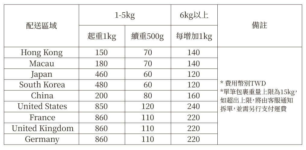 *依據中國當地規範,配送至中國地區,申報價值不得超過人民幣 800 元。 - 因各運送公司不定期調整運費之計算方式,故實際將以結帳時所顯示之運費為主。